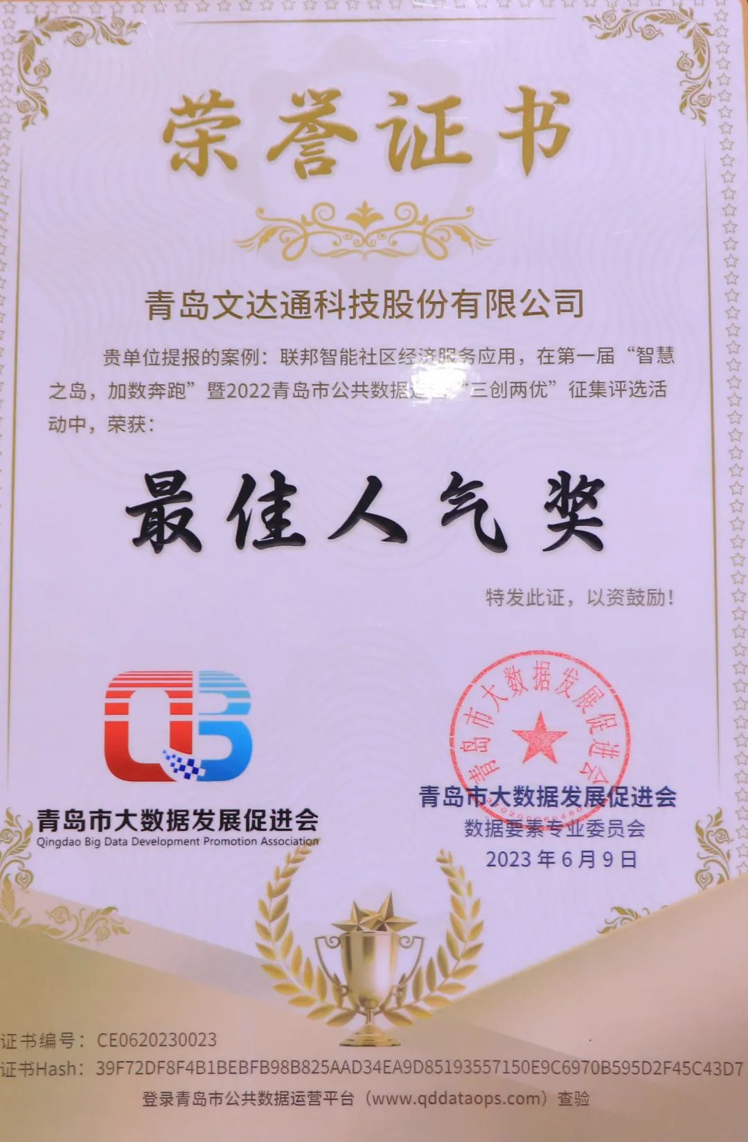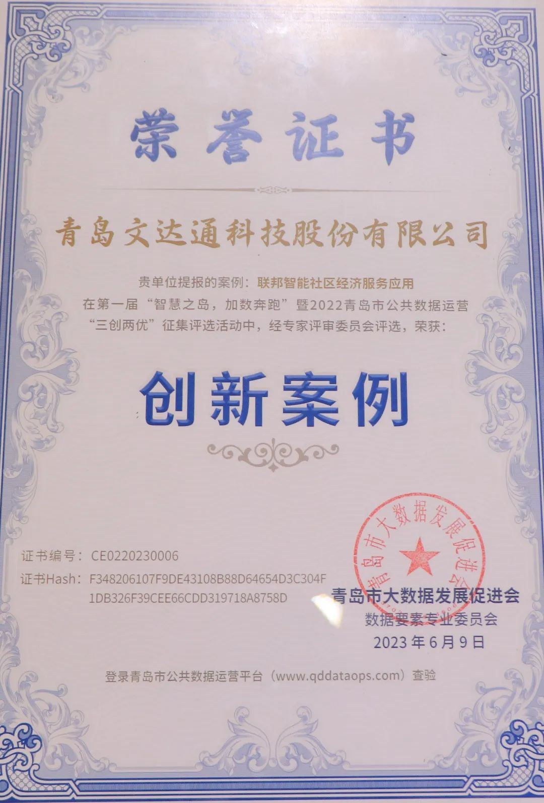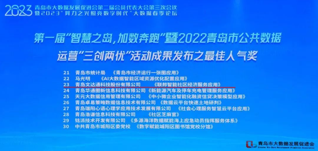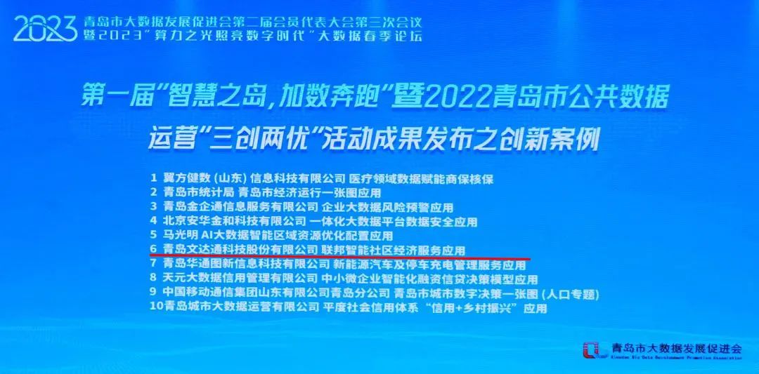 6月9日下午,青島市大數據發展促進會第二屆會員代表大會第三次會議暨“算力之光 照亮數字時代”大數據春季論壇在青島市市級機關會議中心隆重召開。會議由青島市大數據發展管理局指導,青島市大數據發展促進會主辦,以“算力之光 照亮數字時代”為主題,交流行業發展趨勢,解讀政策規劃,展示年度大數據成果。同時,本次大會也對獲獎企業進行了表彰授獎。其中,文達通股份提出的“1+1+3+N”智慧社區運營創新模式榮獲2022年新型智慧城市優秀案例擴面打榜一等獎;提出的聯邦智能社區經濟服務應用榮獲“優秀創新案例”以及“最佳人氣獎”;文達通股份榮獲青島市大數據發展促進會2022-2023年“優秀會員單位”稱號。